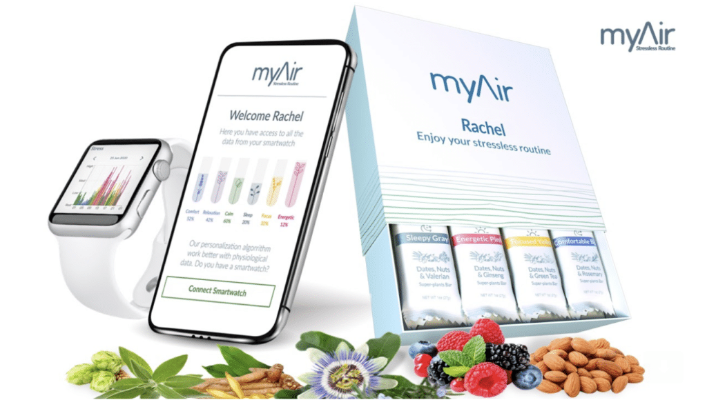 myAir son unas barritas que prometen “reducir el nivel de estrés”: los compradores realizan un cuestionario para determinar su nivel y tipo de estrés individual y luego se les recomienda un régimen personalizado de barras con opciones como “Focused Yellow” y “Calm Green”. Unwind, es una opción de barritas que ofrecen “ sensación de calma y relajación al final del día” para lograr así un mejor dormir. La oferta de Smpl por su parte, incluye Energy Bar, Focus Bar, Immunity Bar y Calm Bar. En terreno de bebidas, también cabe citar el caso de Moment que promete “tomarse la meditación”, dado que la propuesta es ingerir la bebida como un equivalente a los beneficios de llevar a cabo esa práctica.